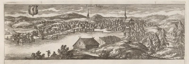 Telge från söder, cirka 1660, Erik Dahlberg, ur Suecia antiqua et hodierna. Foto: (CC BY)