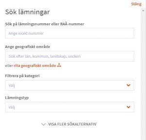 Är du intresserad av en särskild lämningstyp kan du filtrera din sökning genom att lägga till en eller flera typer av lämningar under Lämningstyp. Du öppnar listan med lämningstyper genom att klicka på den röda pilen till höger. Du kan även börja skriva i fältet under Lämningstyp och får då förslag du kan välja ifrån.